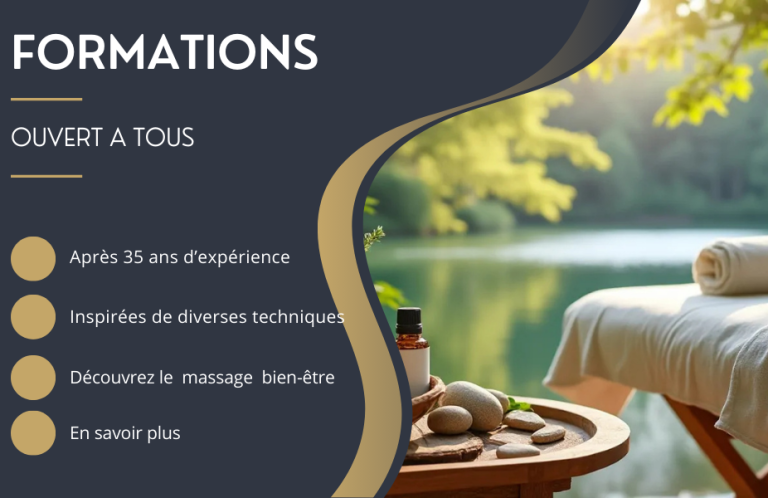 Des formations sur mesures pour tous ceux qui désirent se former aux massages : - pour les professionnels de la beauté, afin d'apporter une autre dimension aux soins, plus authentique, vivante, basée sur la détente. - pour tous : pour apporter du bien-être par le toucher.